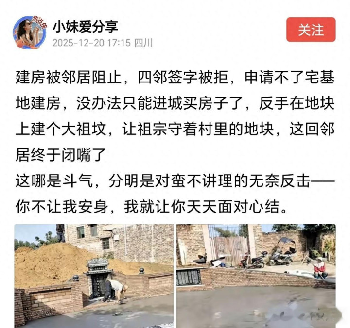 臻臻老家村委会也被点名。按制度,遇到邻居意见不合,村委会该出面调解。但很多村就甩锅给村民,“不同意就不批”。结果矛盾越积越多,最后村民只能出狠招。像臻臻这招建祖坟,算是把问题又甩回去了。