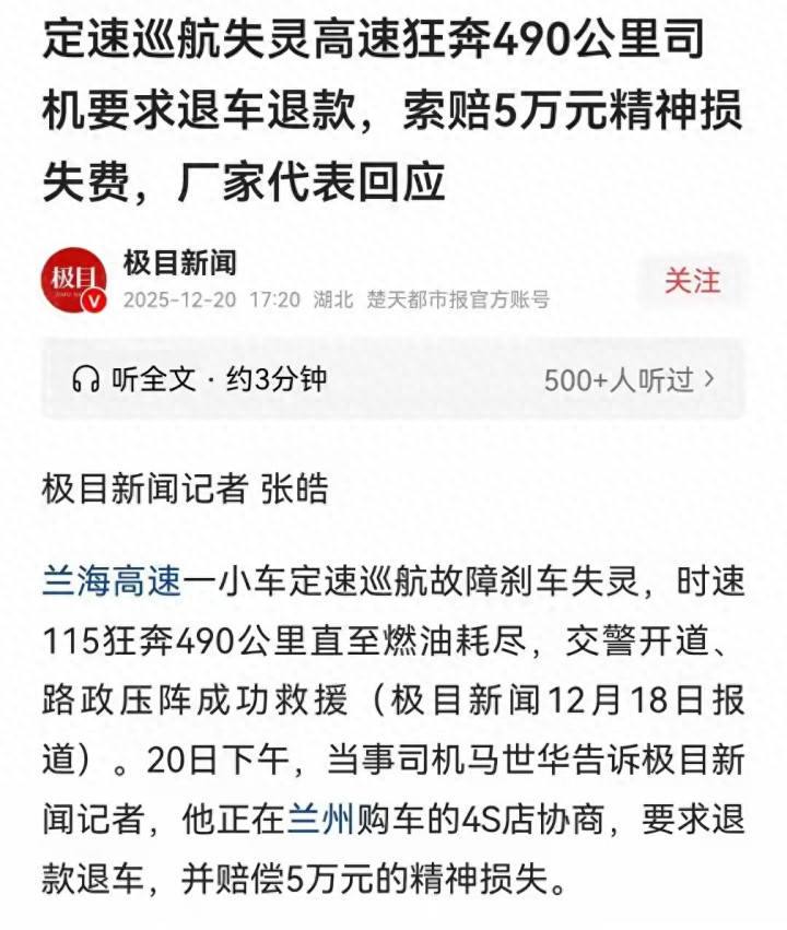 这个案例给我最大触动,是敲醒行业:智能辅助失灵时,怎缺独立备份?这讽刺太大了——靠“油干”停车,网友调侃“物理终极刹车”,但电动时代连这都没了。在我看来,监管得跟上:强制纯机械冗余、黑匣子记录;厂家别私了捂嘴,主动透明邀专家媒体见证,才重建信。反问一句:如果没马世华坚持,我们还蒙在鼓里多久?说真的,这推动维权新模式:不满足封口费,要系统安全。